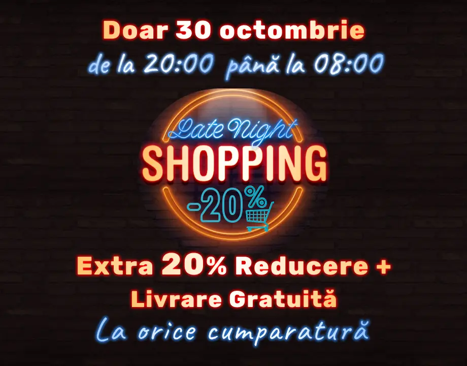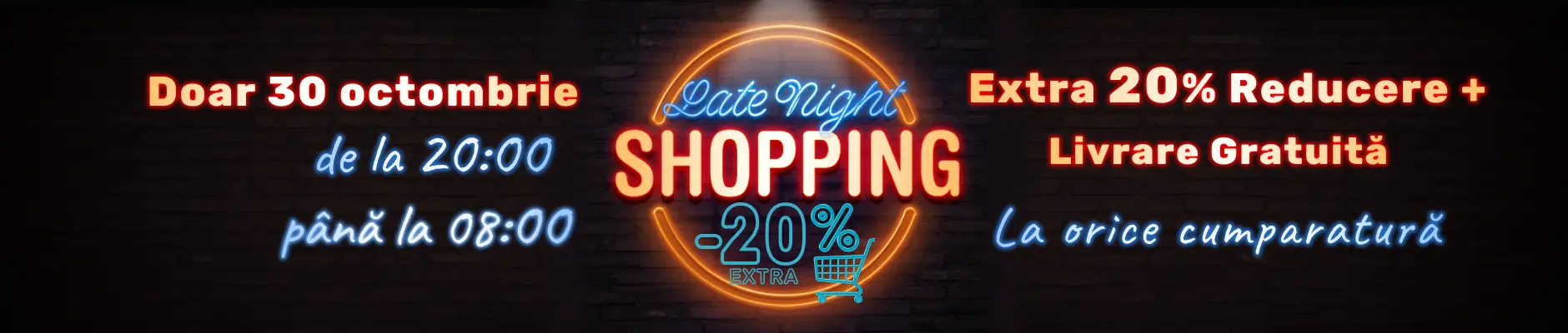 Late Night Shopping este o noapte de reduceri unică, ce are loc o dată pe an, când ofertele speciale sunt valabile doar pentru o perioadă limitată. Timp de 12 ore, poți profita de cele mai bune prețuri din an. Promoția se aplică pentru întregul sortiment al site-ului, inclusiv în secțiunea Oferte și Reduceri.