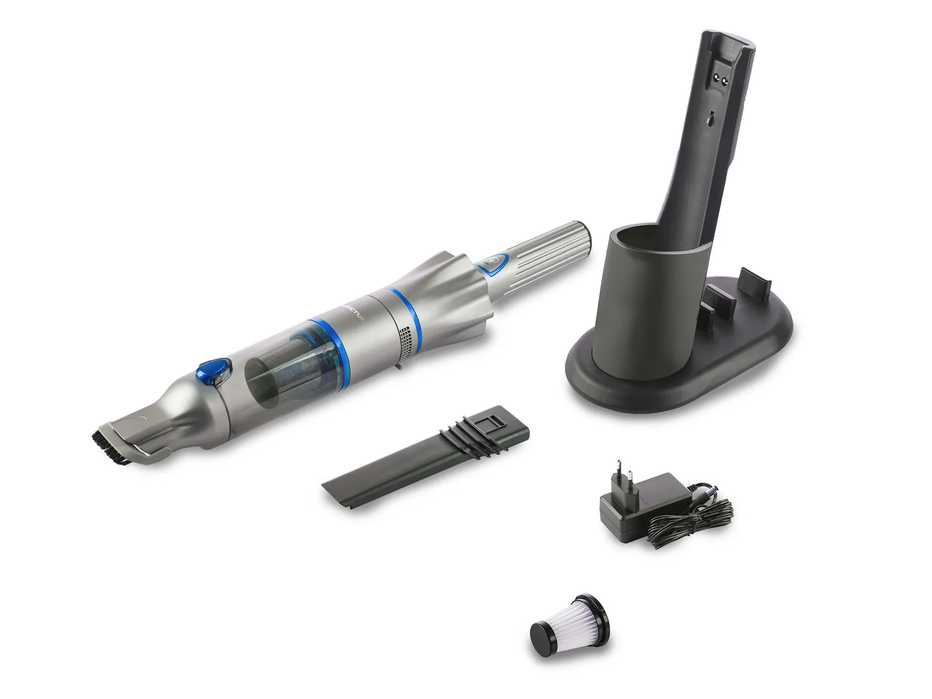 Aspiratorul fără fir funcționează până la 20 de minute fără reîncărcare, suficient pentru curățarea mai multor camere sau a interiorului mașinii. Sistemul de accesorii permite accesul în colțurile greu accesibile, iar designul ergonomic face utilizarea simplă și comodă. Este perfect pentru aspirarea mobilierului, rafturilor, covoarelor și a mașinii.