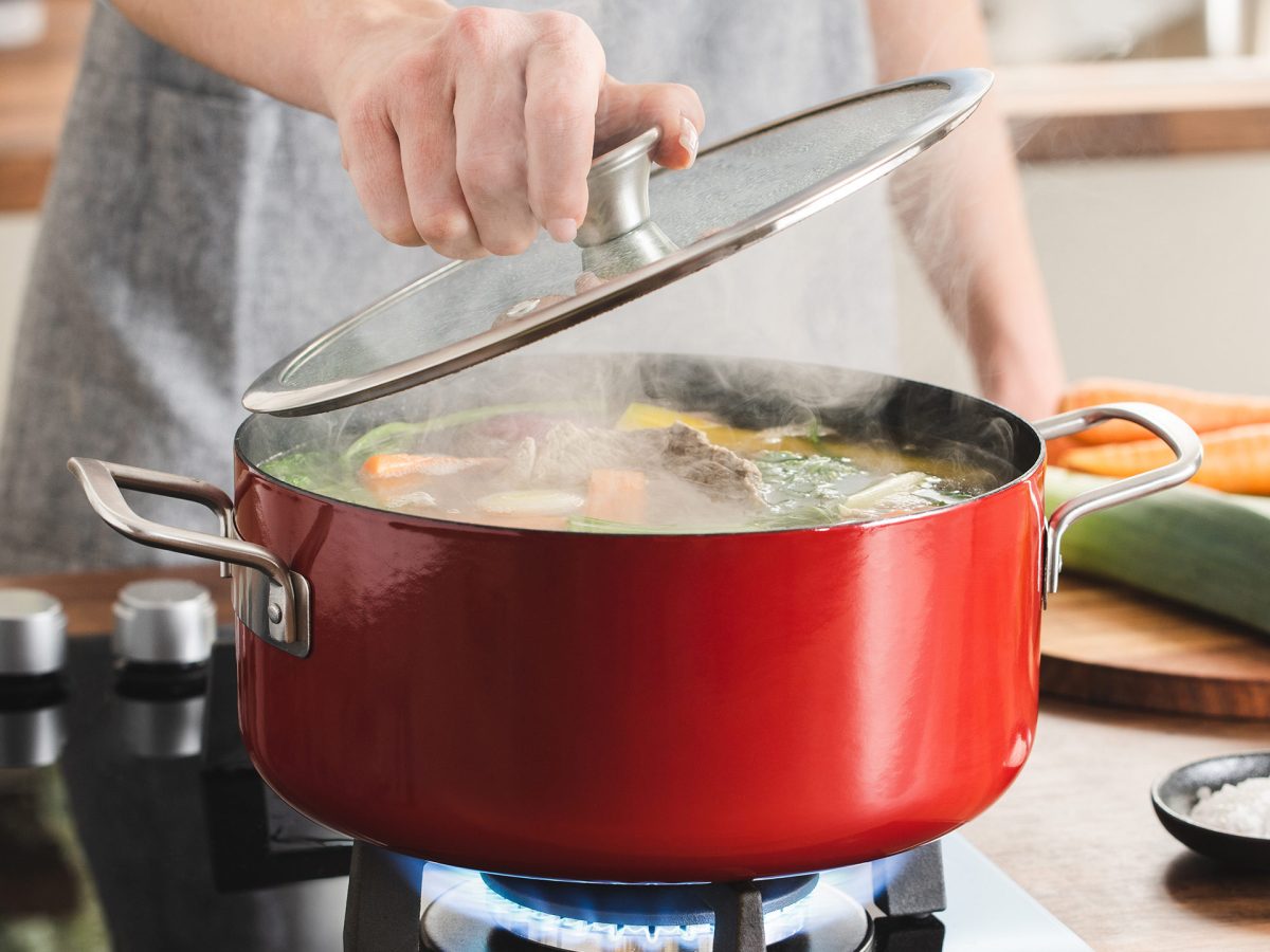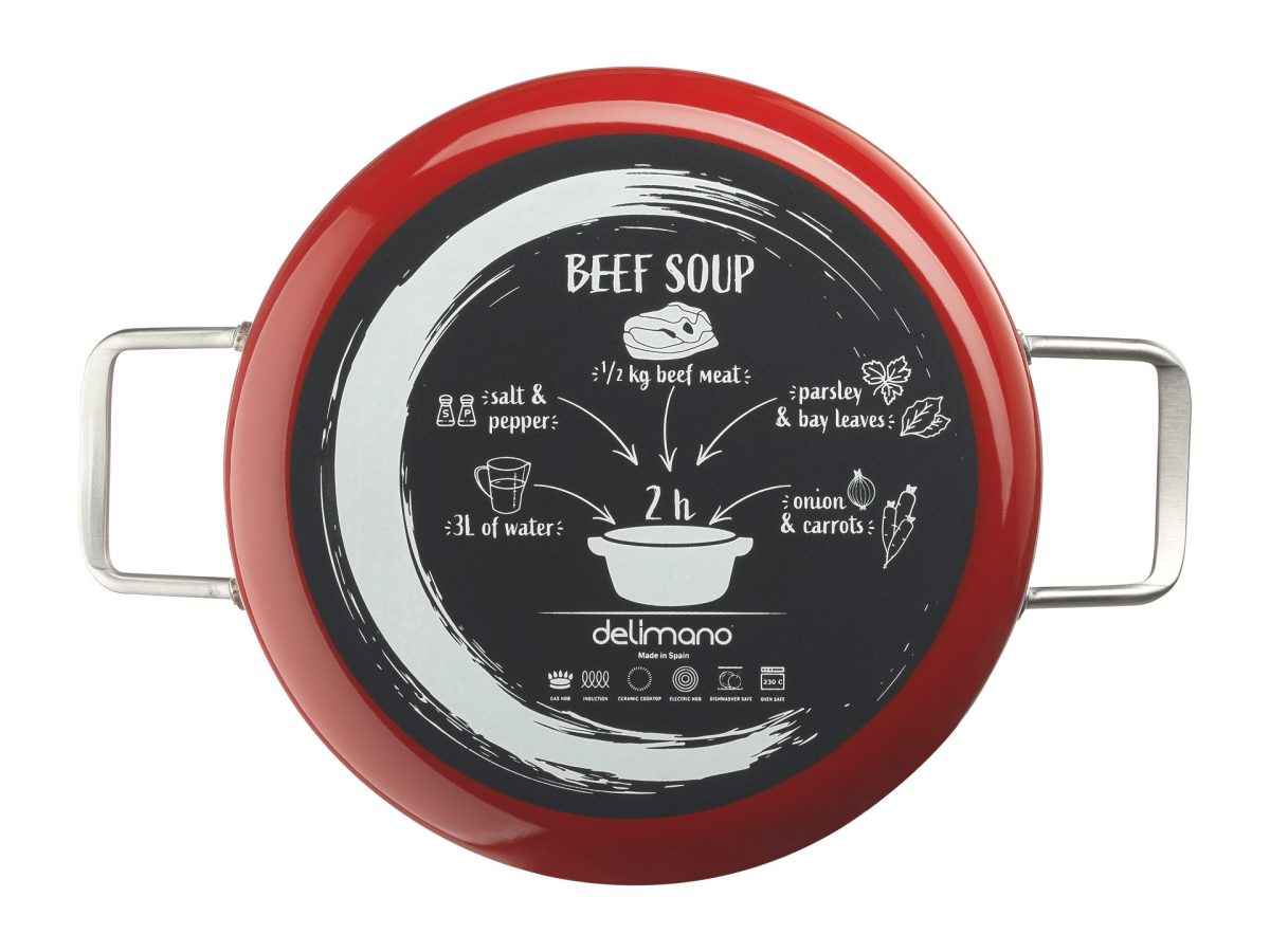 Cratita este dotata cu mainere din otel, de aceea o puteti utiliza la prepararea bucatelor in cuptor, de asemenea gasiti in cratita o reteta de supa din carne de vita cu usturoi.
