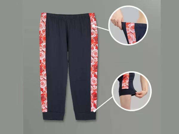 Setul este compus dintr-un hanorac cu fermoar și buzunare practice, inserții elegante și imprimeu floral, precum și pantaloni 7/8 mulați cu dungi laterale. Mâneca 3/4 ascunde micile imperfecțiuni, iar croiala dreaptă a pantalonilor oferă libertate de mișcare. Realizat din 100% bumbac, costumul este respirabil, plăcut la atingere și își păstrează forma chiar și la utilizare intensă.