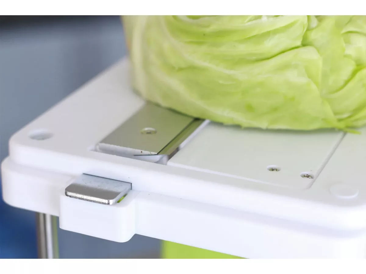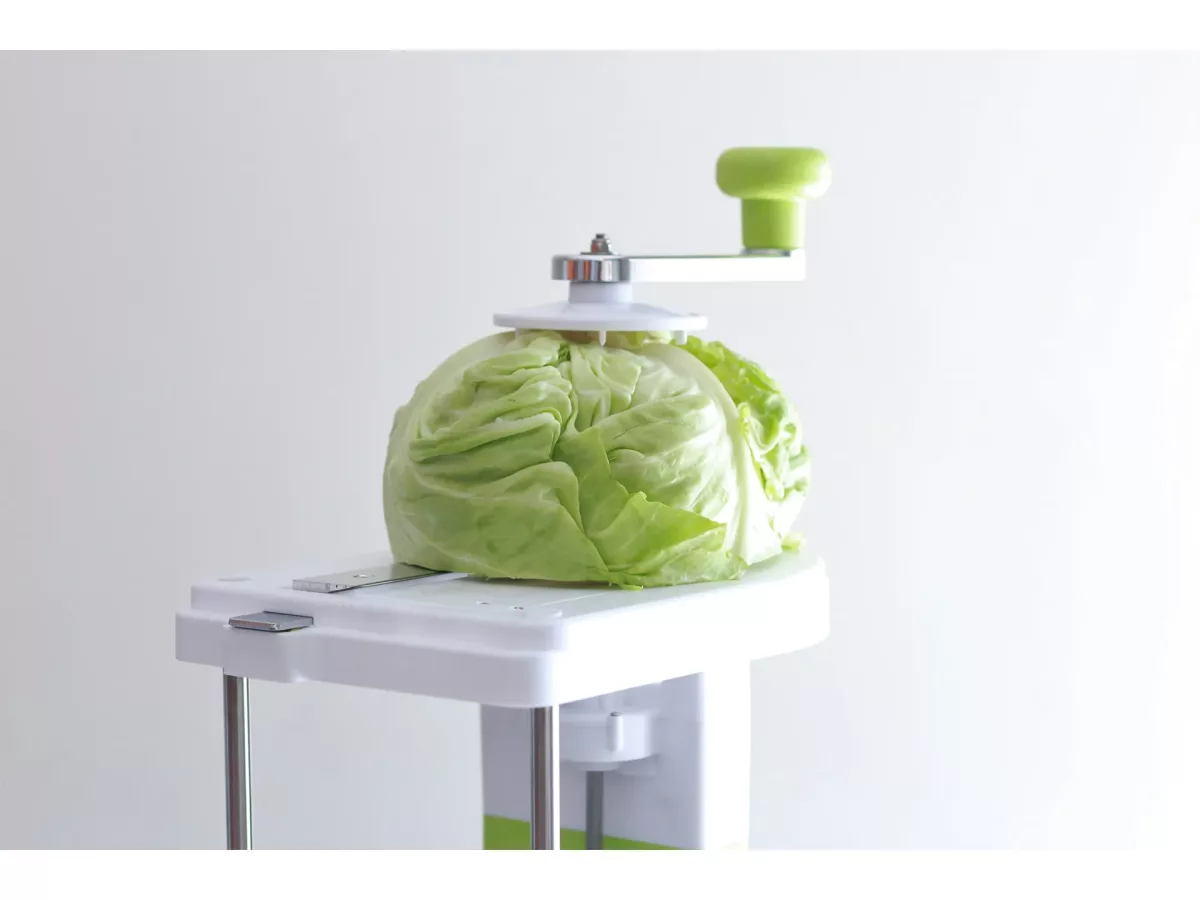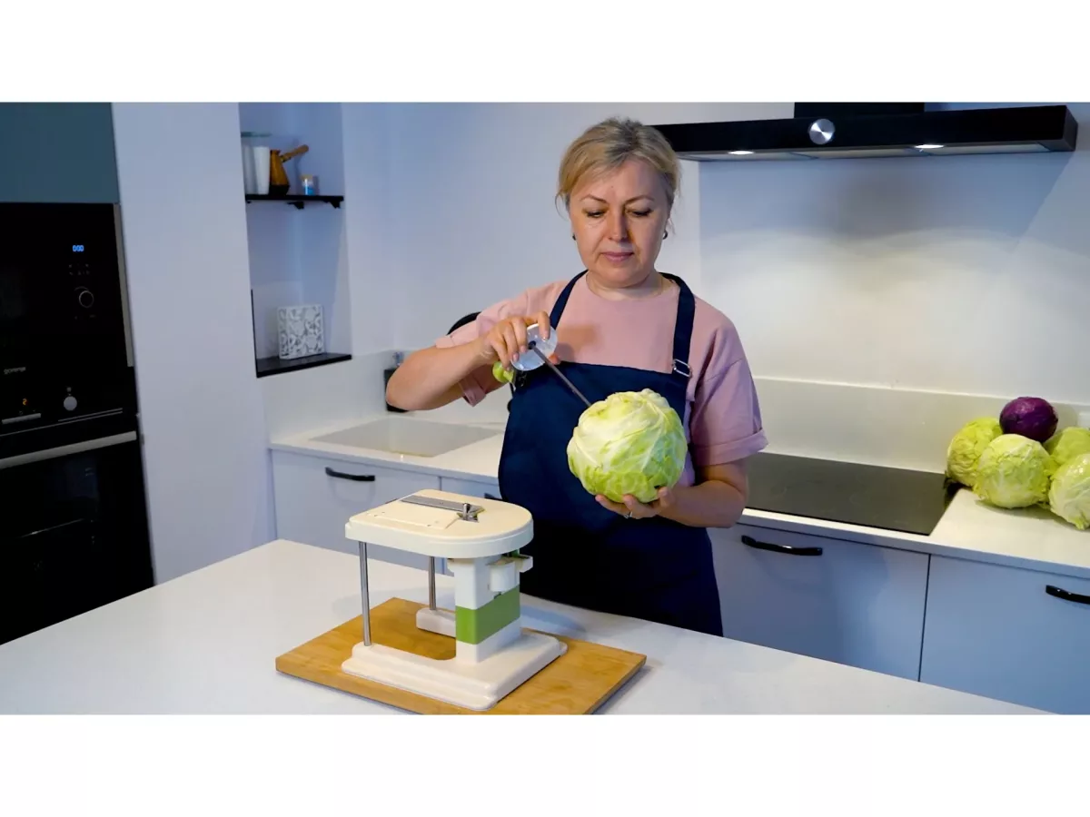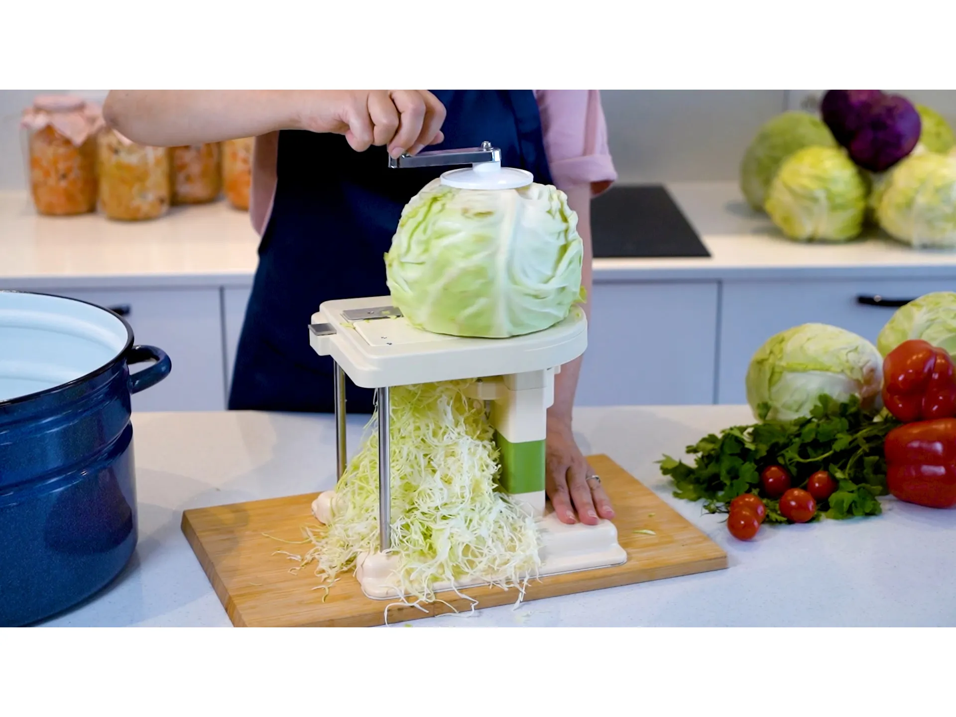 - Usor de folosit. Fixati capul de varza, setati latimea de taiere dorita, rotiti butonul. Gata!