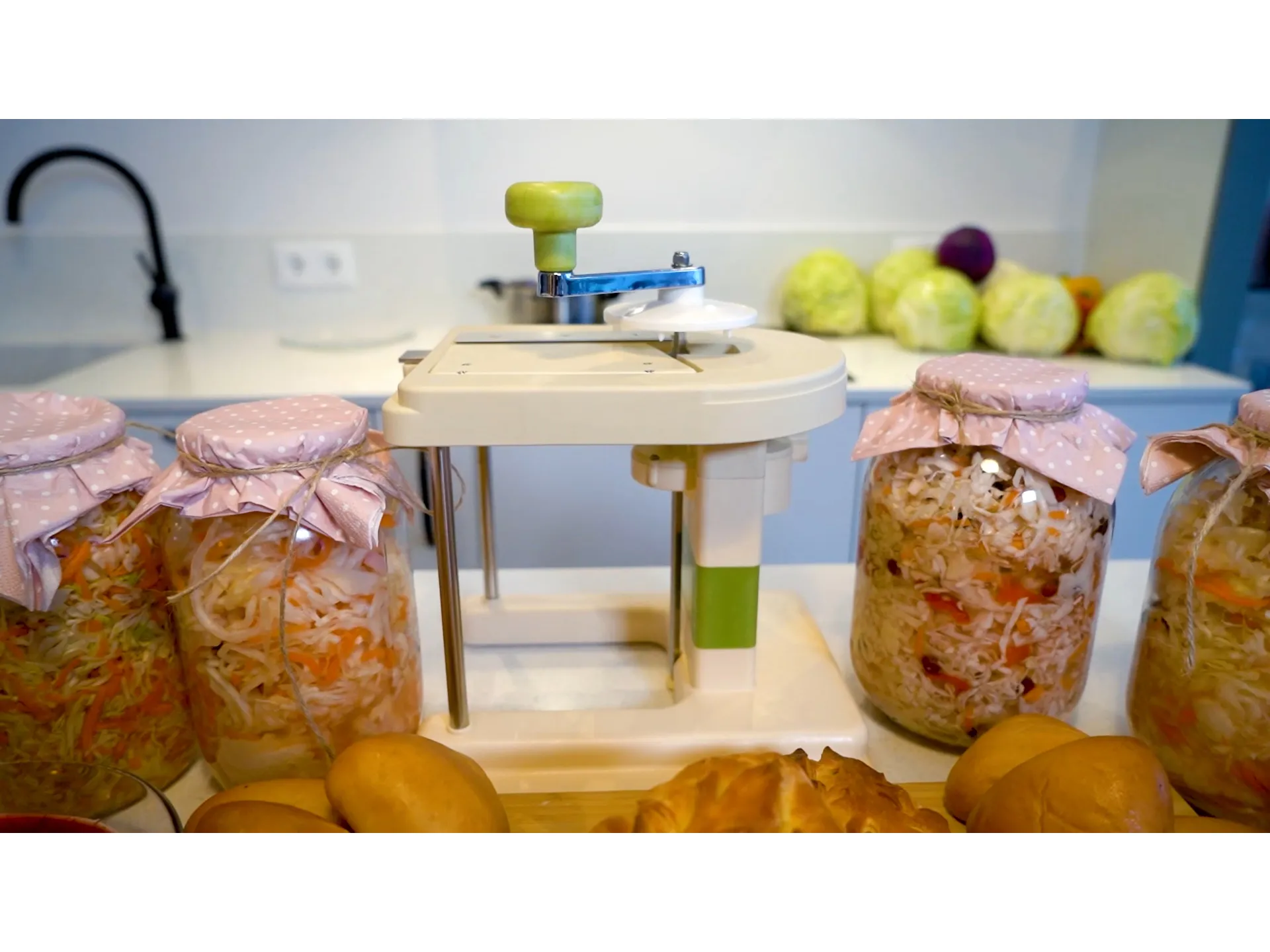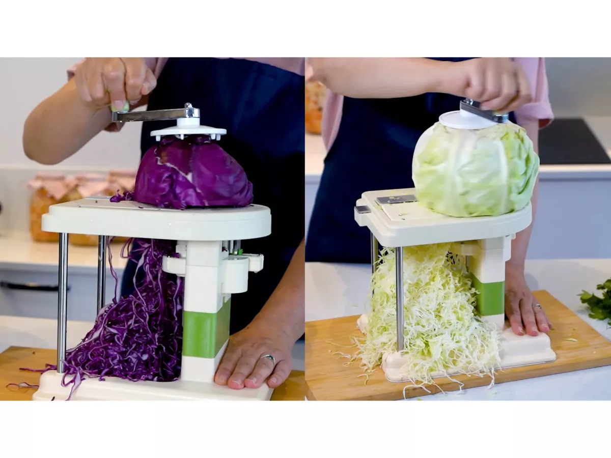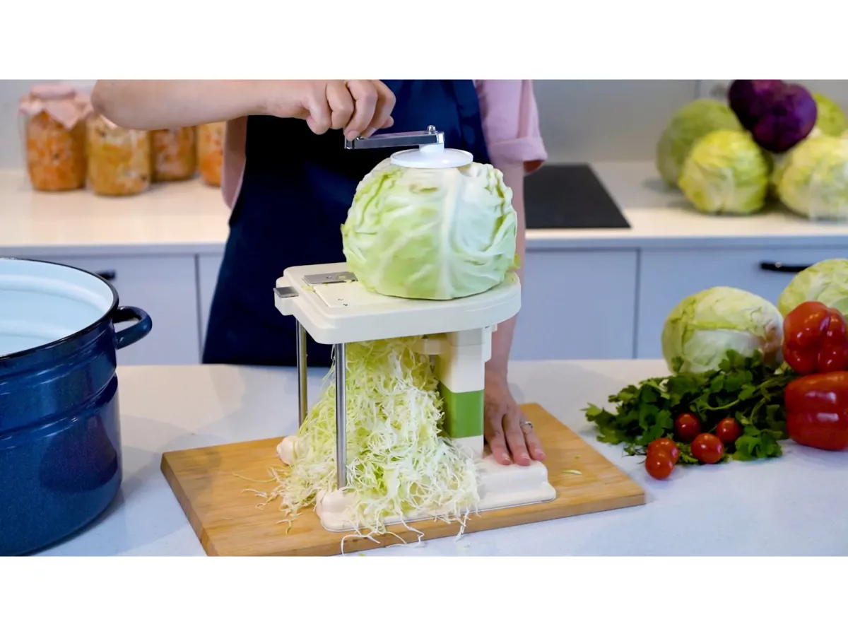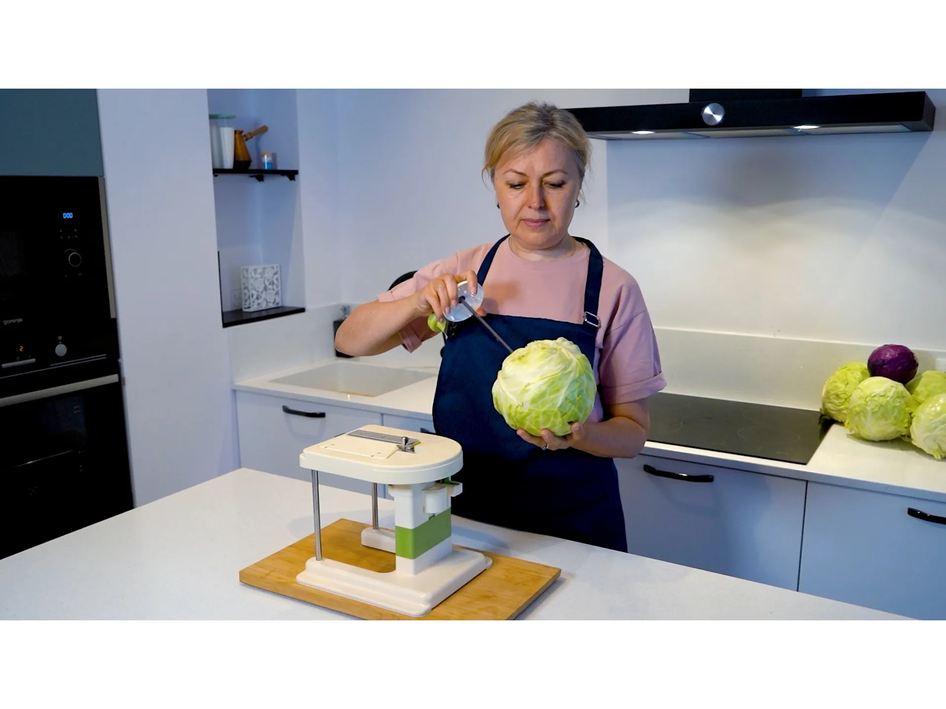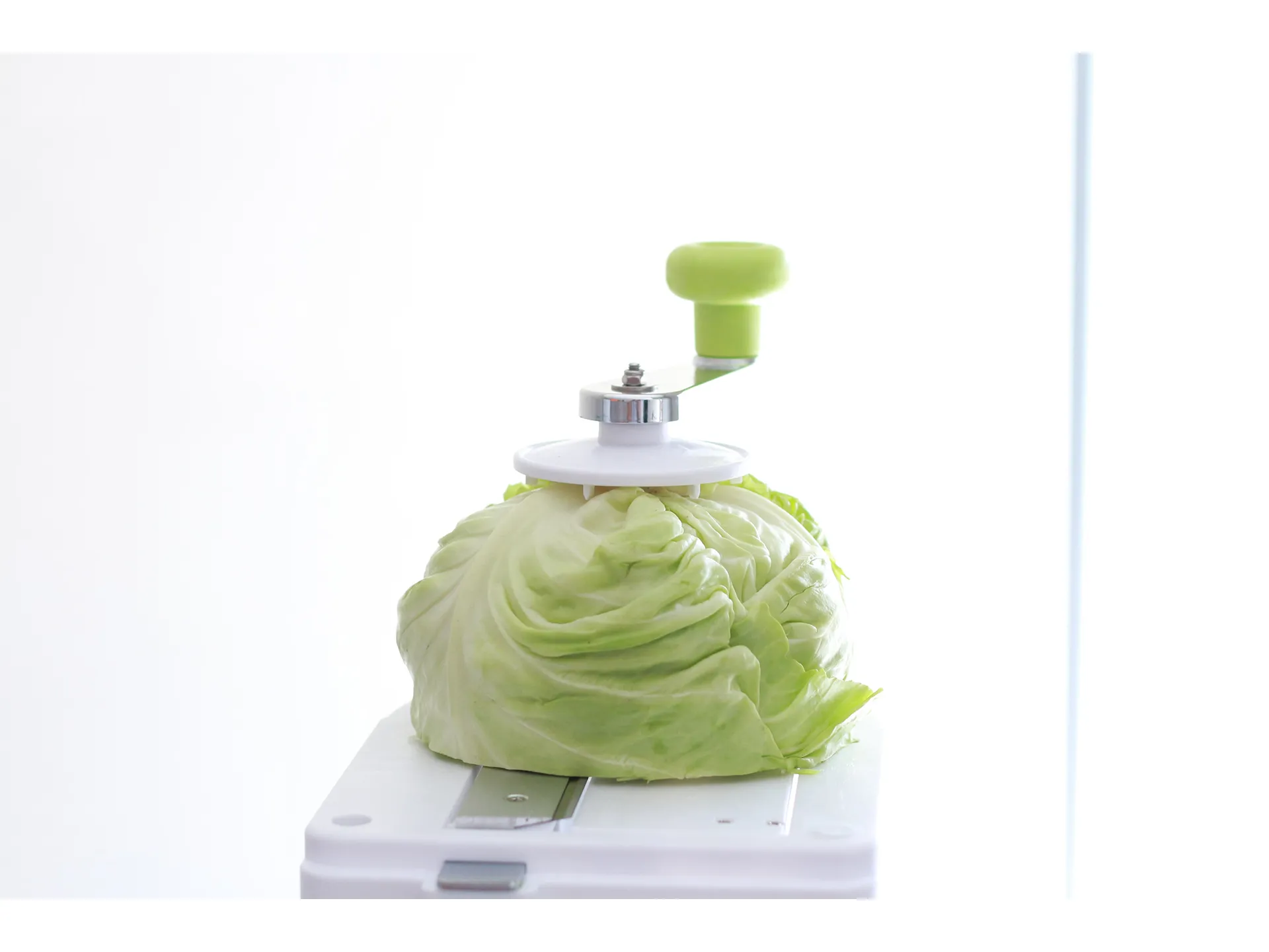 - Usor de folosit. Fixati capul de varza, setati latimea de taiere dorita, rotiti butonul. Gata!