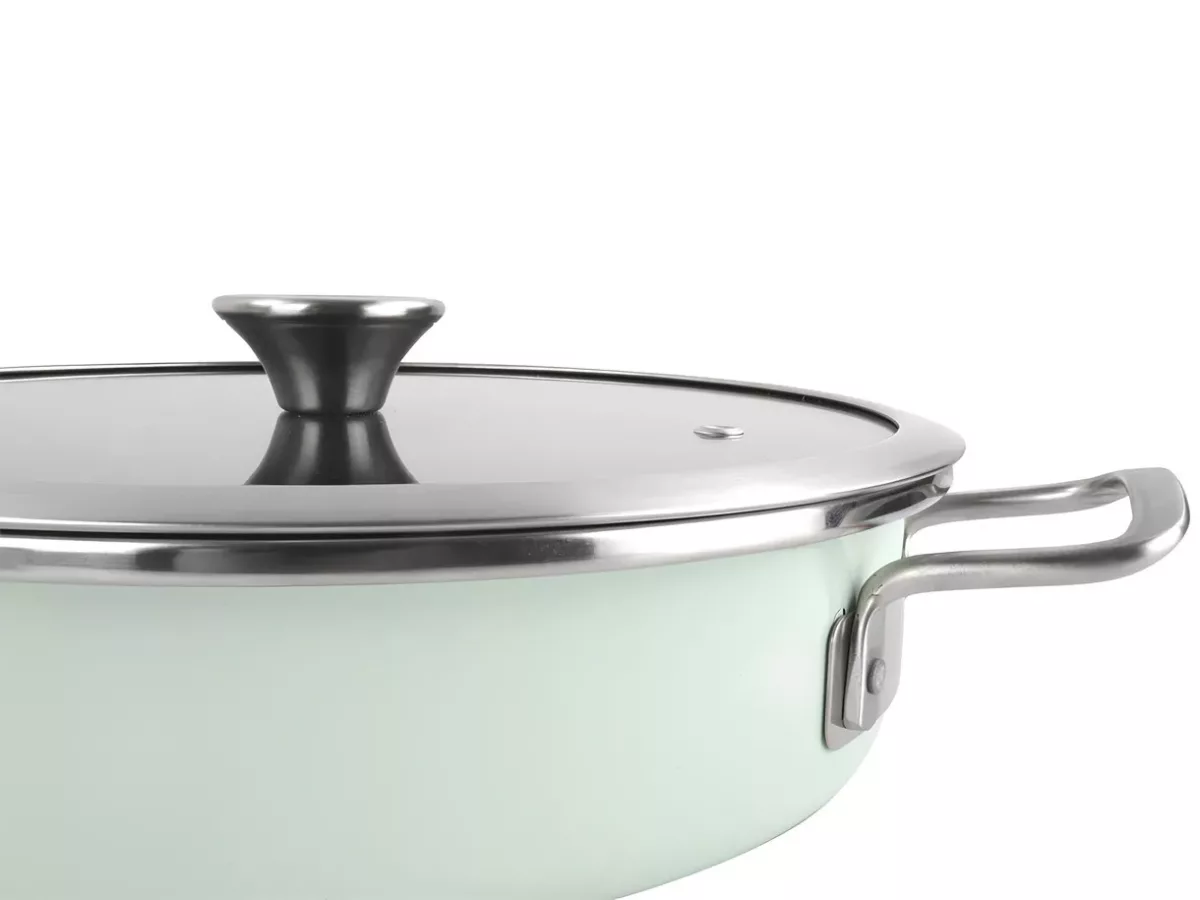 Tava este realizata din otel vitrificat acoperit cu un strat emailat rezistent, tratat la 820 °C. Interiorul este dotat cu strat antiaderent cu efect de piatra, fara substante toxice precum PFOA. Astfel, gatesti sanatos pentru tine si familia ta, dar protejezi si mediul.