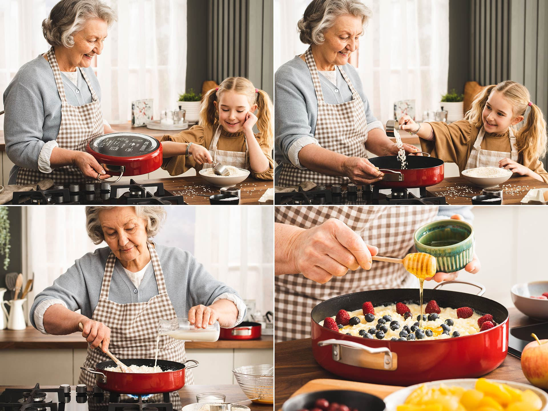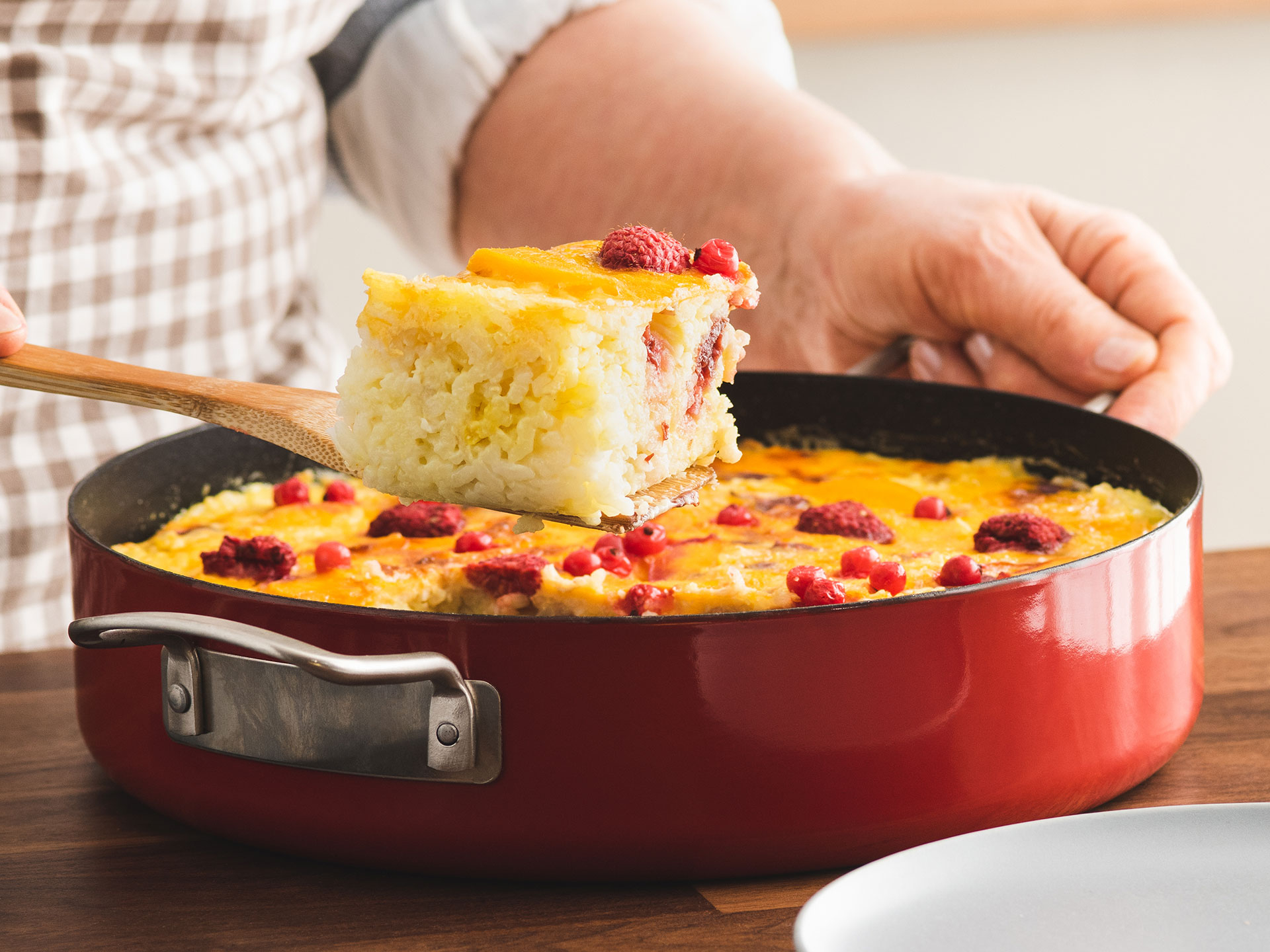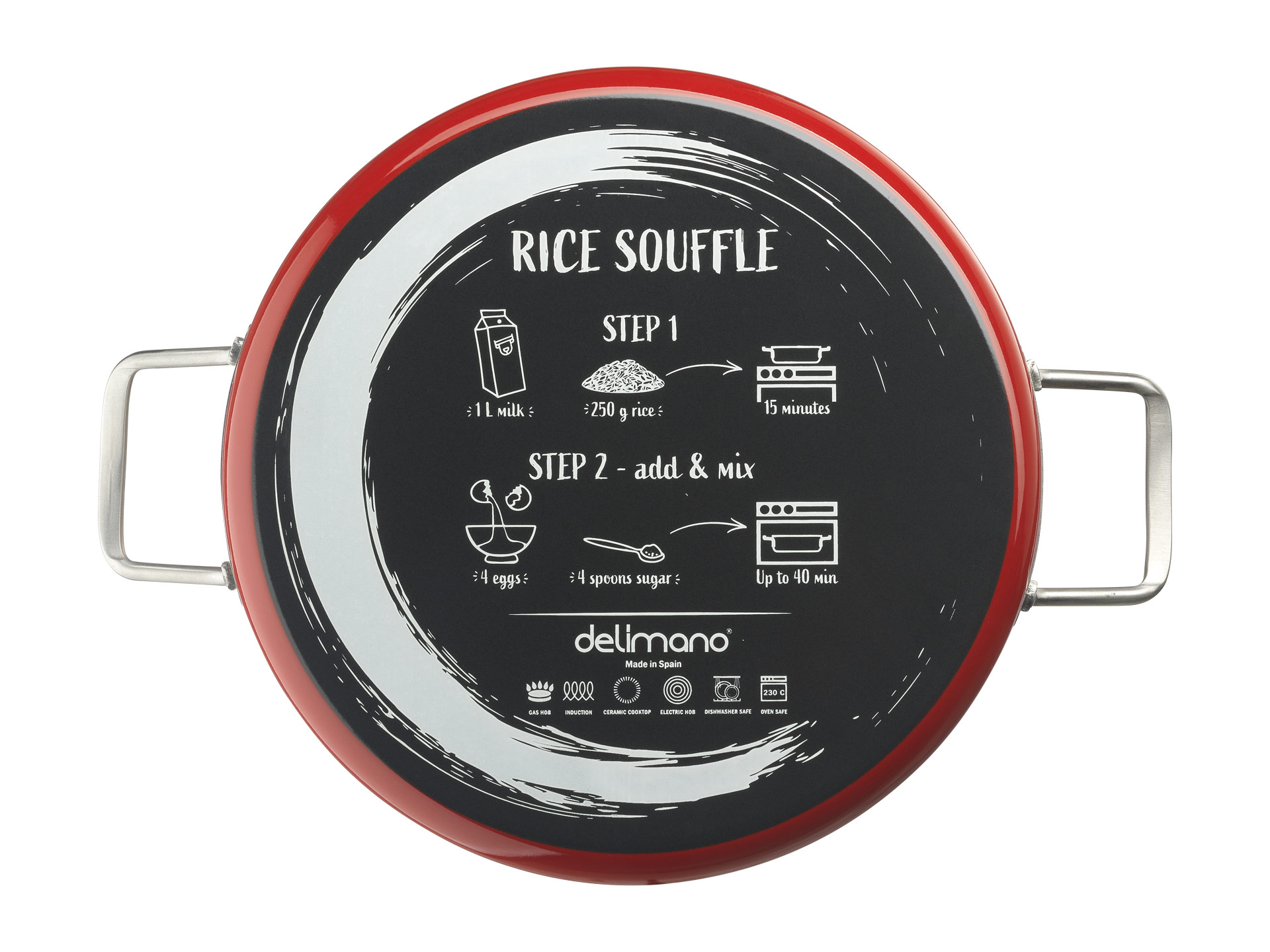 Tava este dotata cu mainere din otel, de aceea o puteti utiliza la prepararea bucatelor in cuptor. In interiorul vasului veti gasi o reteta de sufleu de orez.