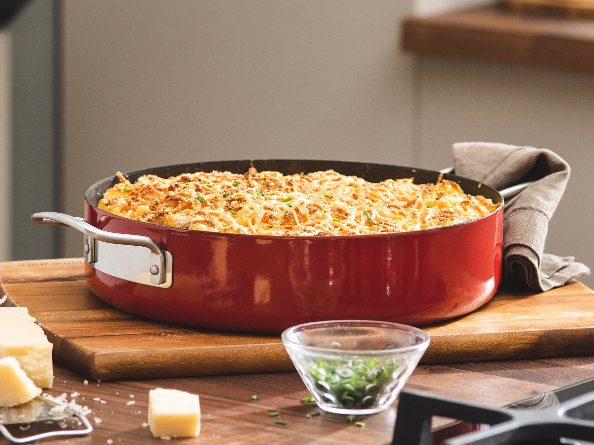 Nu veti simti nici un fel de restrictii in cazul in care veti dori sa experimentati cu noi retete sau cu bucate traditionale. Baza din otel carbon asigura distribuirea uniforma a caldurii, iar invelisul antiaderent din trei straturi si dotat cu particule de titaniu fac aceasta tava sigura si durabila.