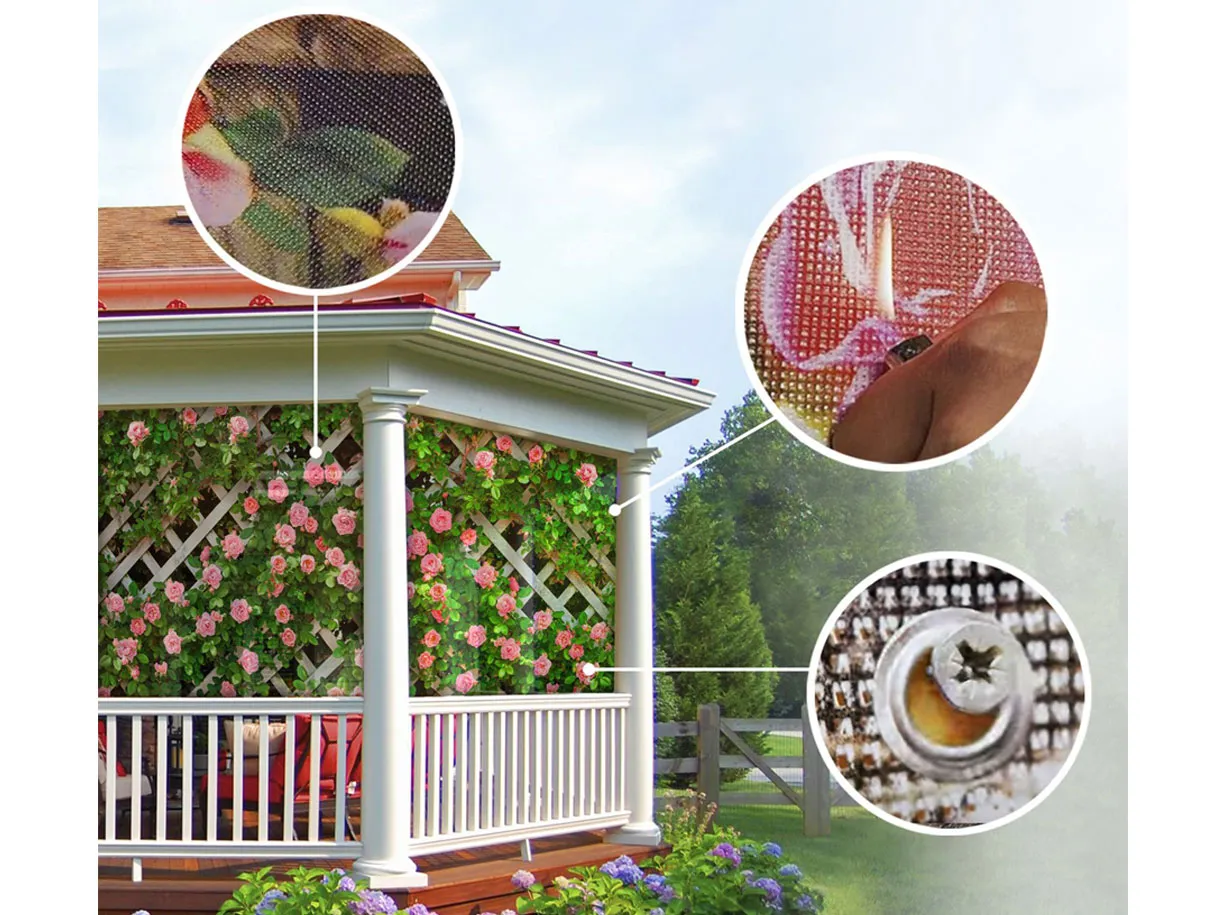 Instalarea durează doar câteva minute – fixează plasa cu ajutorul ocheților (incluși în set) sau cu capsatorul pentru mobilă. Nu sunt necesare abilități de construcții sau unelte complexe. Materialul rezistă la soare, ploaie și vânt, nu se decolorează și nu se deformează. Chiar și după mai multe sezoane, își păstrează culorile vii și aspectul atractiv.
