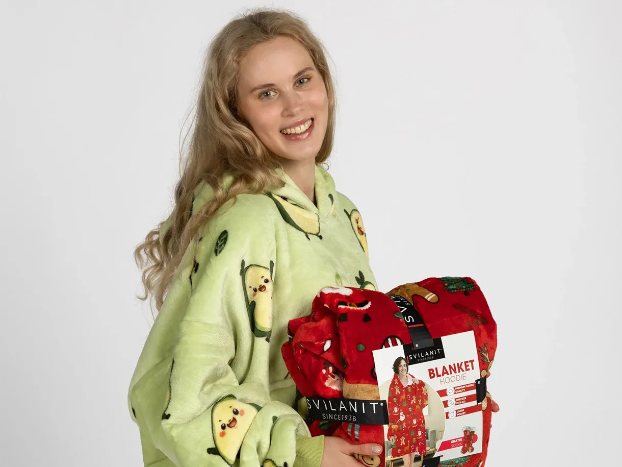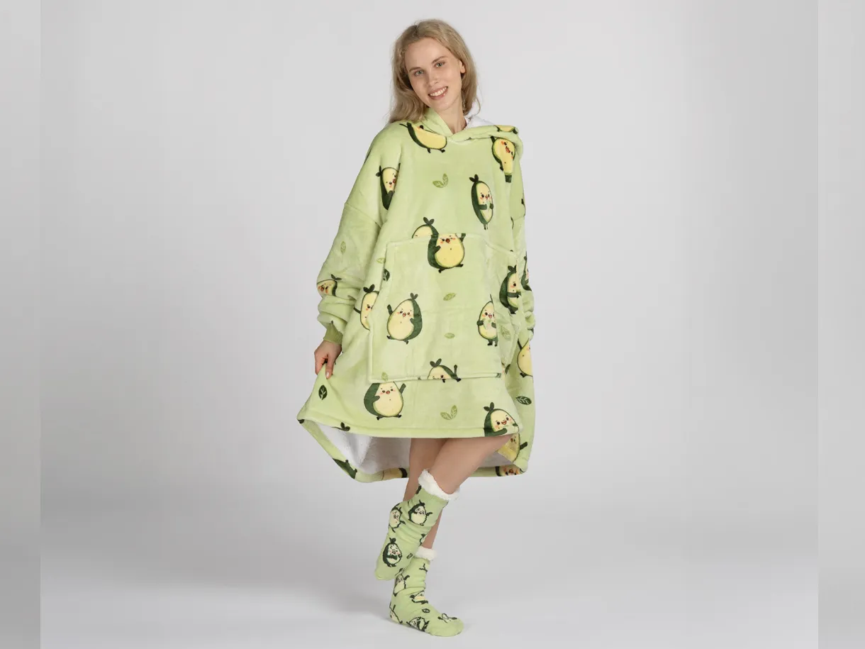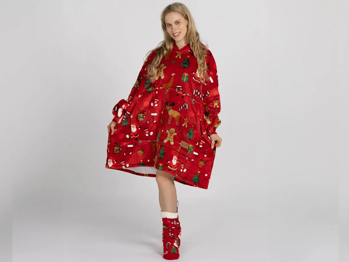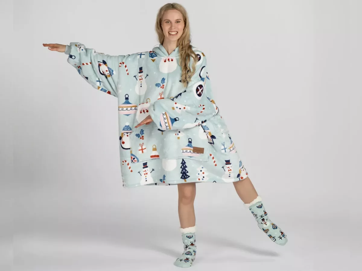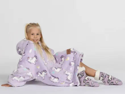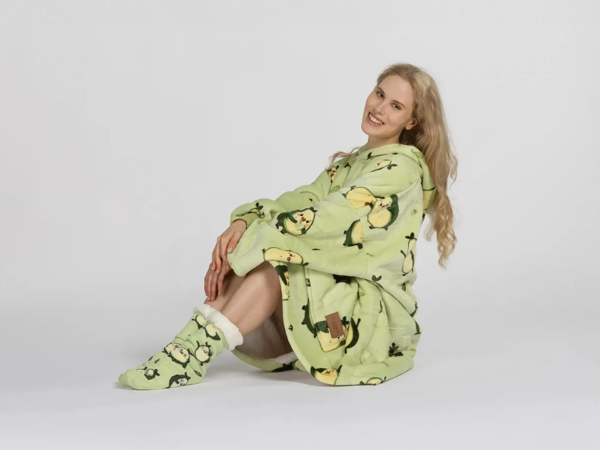 Setul include o pereche de șosete moi cu talpă antiderapantă. Acest pachet este alegerea perfectă pentru a fi oferit celor dragi. Hanoracul cu glugă se potrivește atât adulților, cât și copiilor, iar mărimea universală îl face potrivit pentru întreaga familie. Culorile vii și designul modern vor aduce buna dispoziție și vor transforma fiecare seară într-un moment special.