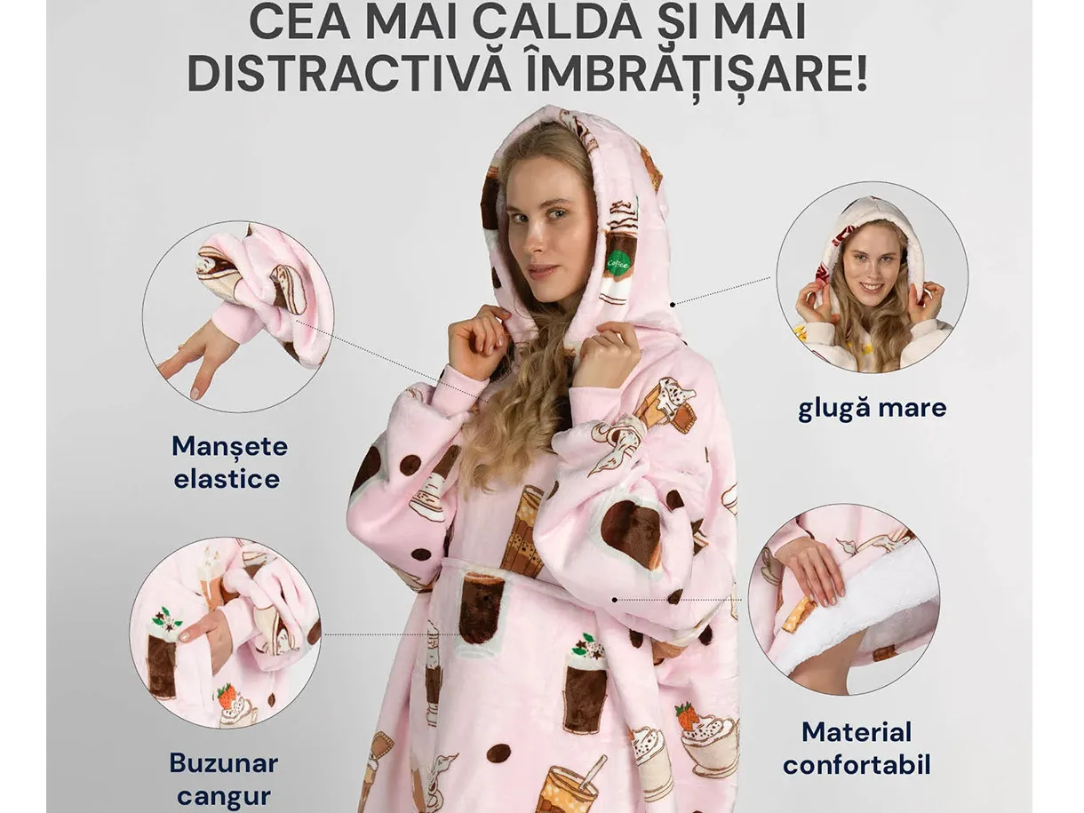 Hanorac cu glugă Vita este soluția modernă pentru cei care își doresc căldură și confort în orice anotimp. El combină funcționalitatea unei pături călduroase cu practicitatea unei haine, oferind o senzație unică de relaxare. Stratului interior îi revine rolul de a păstra căldura corpului, iar țesătura moale îmbrățișează delicat pielea. Datorită glugii spațioase și mânecilor lungi, te poți înfășura complet fără să îți limitezi mișcările.