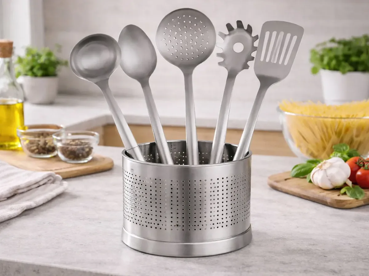 5 accesorii esentiale de bucatarie: lingura, spatula, lingura cu fanta, oala si lingura pentru spaghete – suficiente pentru a face gatirea usoara, rapida si distractiva. Articolele sunt fabricate din otel inoxidabil de inalta calitate, rezistent la coroziune. Usor de curatat si intretinut: se poate spala in masina de spalat vase. Datorita aspectului sau elegant si designului minimalist, acest set este potrivit pentru orice bucatarie, atât pentru profesionisti, cat si pentru incepatori! (Suportul nu este inclus in set)