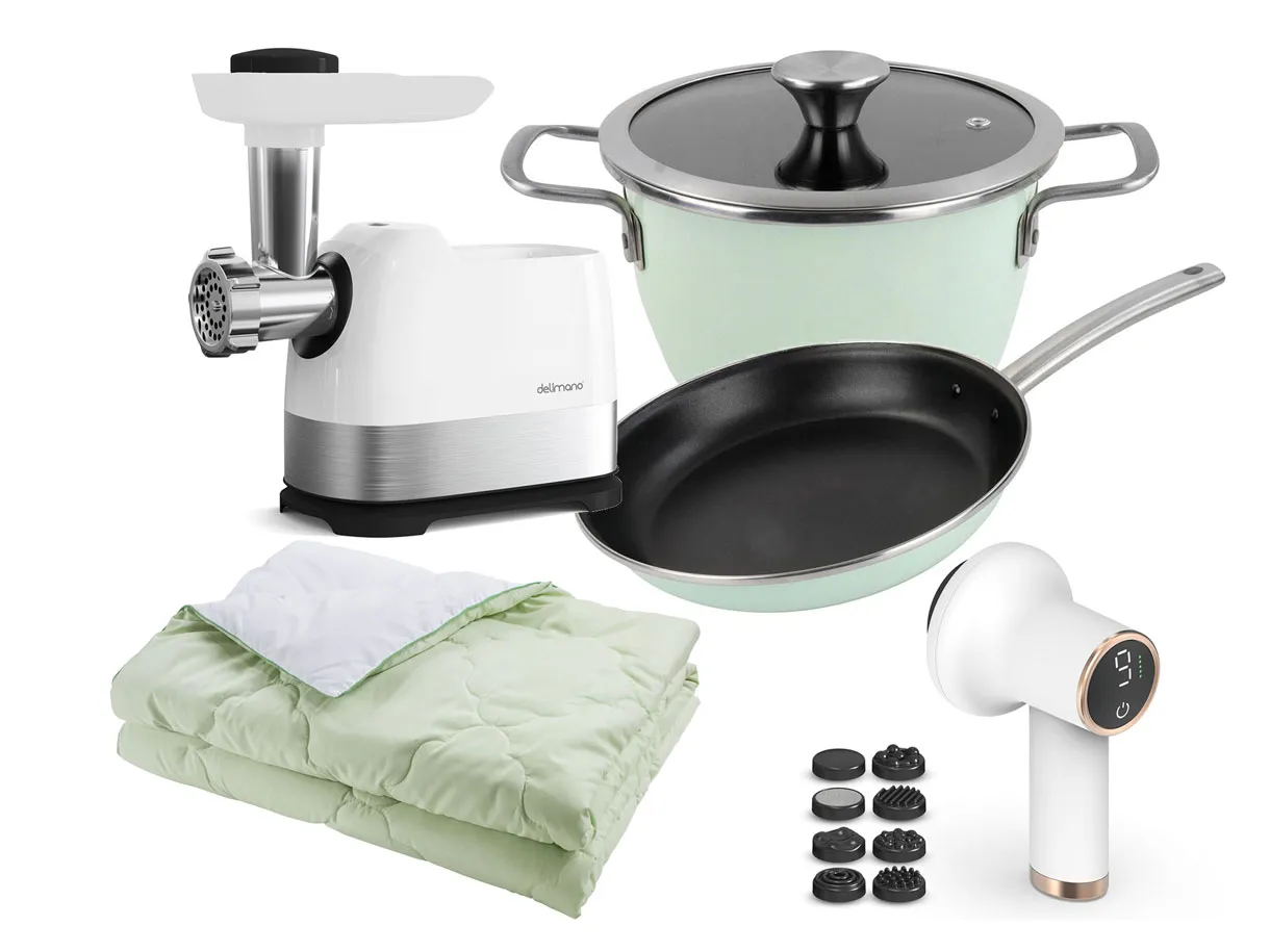 Set aniversar “Top Shop 15 ani” include 5 produse de top Delimano, Dormeo și Wellneo – tigaie, oală, mașină de tocat, plapumă și aparat de masaj. Practic, calitativ și cu livrare rapidă în toată Moldova.