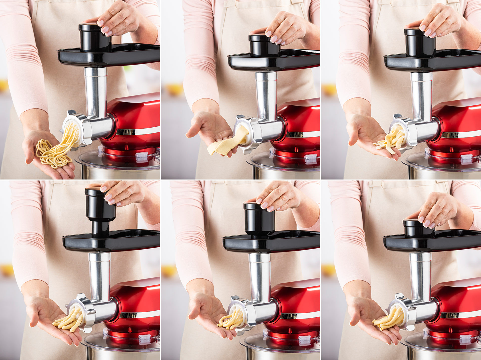 Setul pentru prepararea pastei si a biscuitilor include 6 duze pentru paste, ce se ataseaza perfect la duza pentru masina de tocat (ce face parte din setul pentru prepararea carnaciorilor si a salamului). Gatiti taitei ingusti sau largi, rigatoni, paste, spagheti subtiri si largi. Dar, asta nu e tot. Utilizand accesoriul special puteti utiliza 4 feluri de biscuiti.