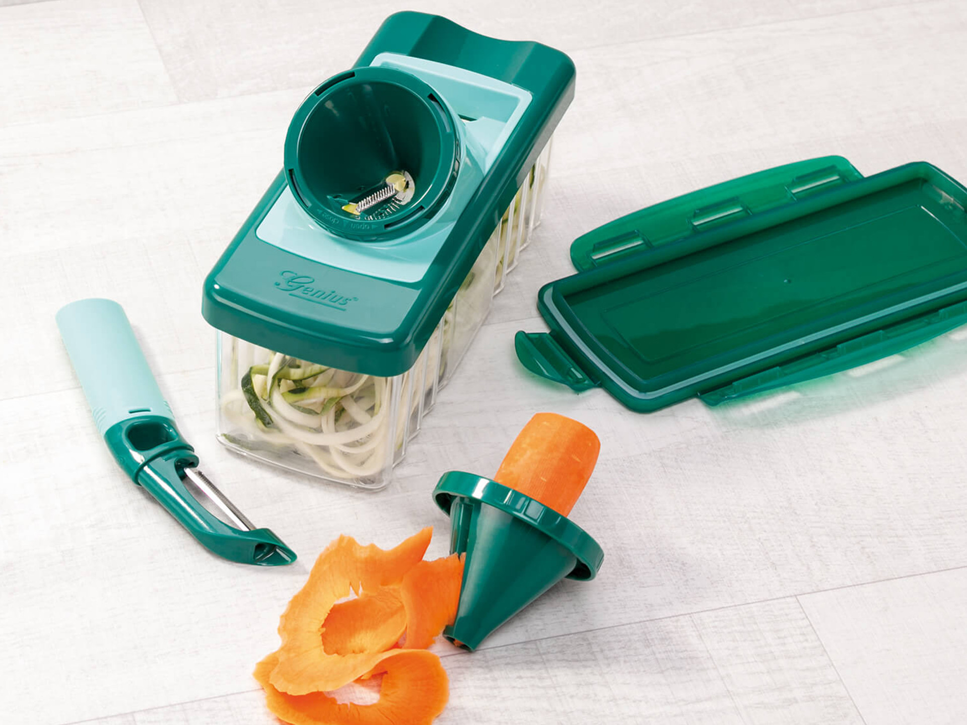 Spiralizatorul Genius Julietti Plus – este un dispozitiv simplu de utilizat, ce va ajuta sa preparati spirale decorative din fructe si legume sau paste cu un nivel mic de carbohidrati, in doar cateva minute: