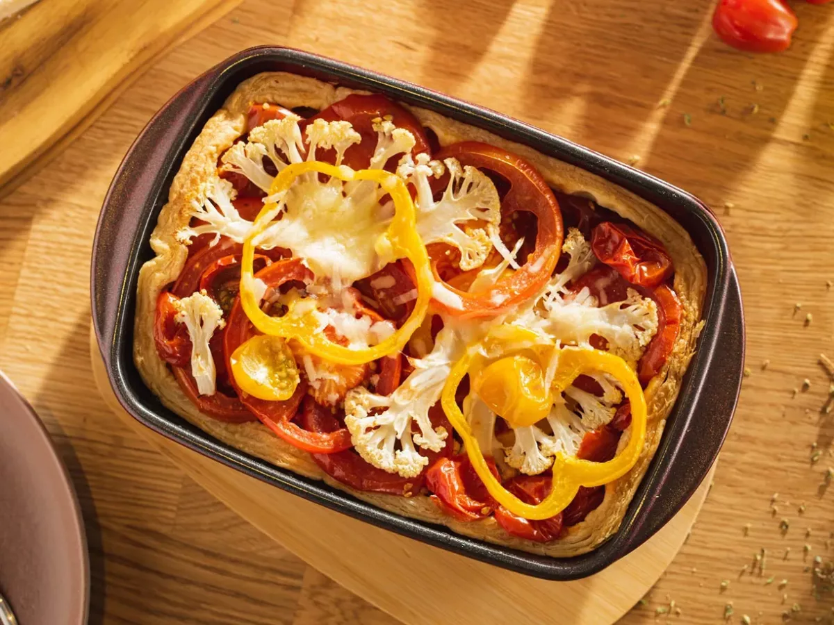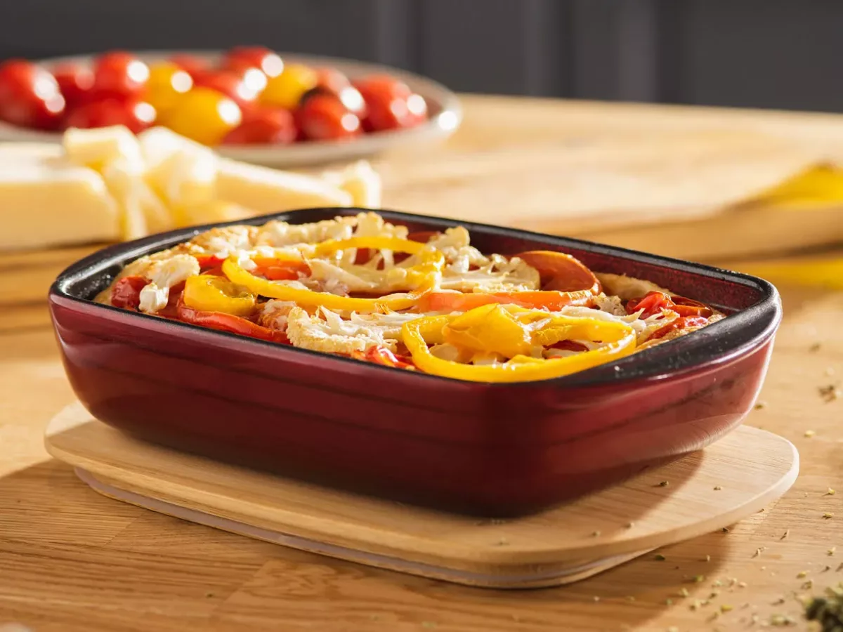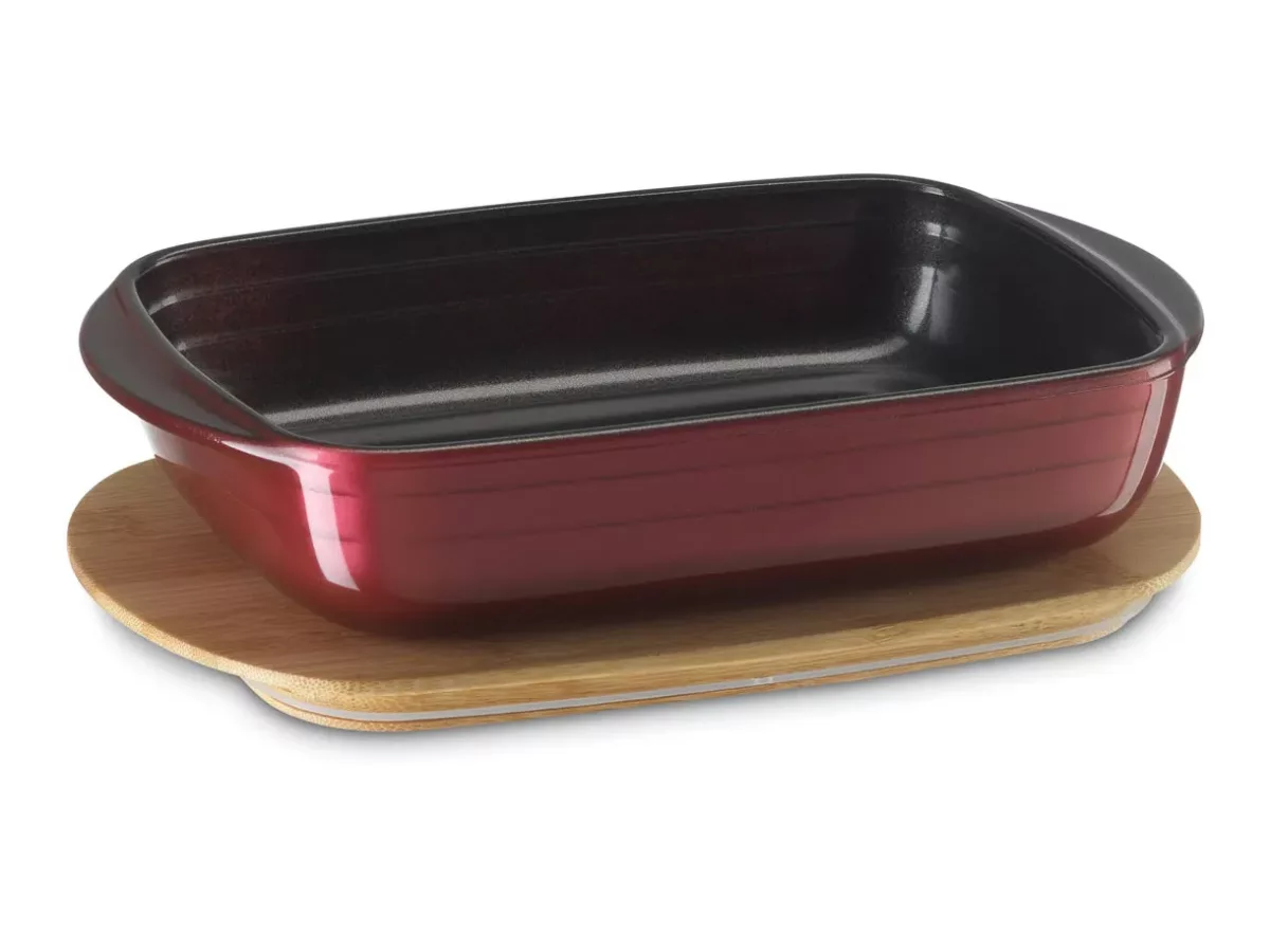 Setul include o tavă mică și un capac elegant din bambus. Combinația este excelentă pentru preparare, depozitare și servire. Poți aduce preparatul direct la masă – sticla transparentă oferă un aspect modern, iar capacul din bambus poate fi folosit ca suport care protejează suprafața mesei de temperaturi ridicate.