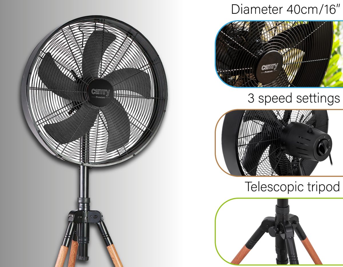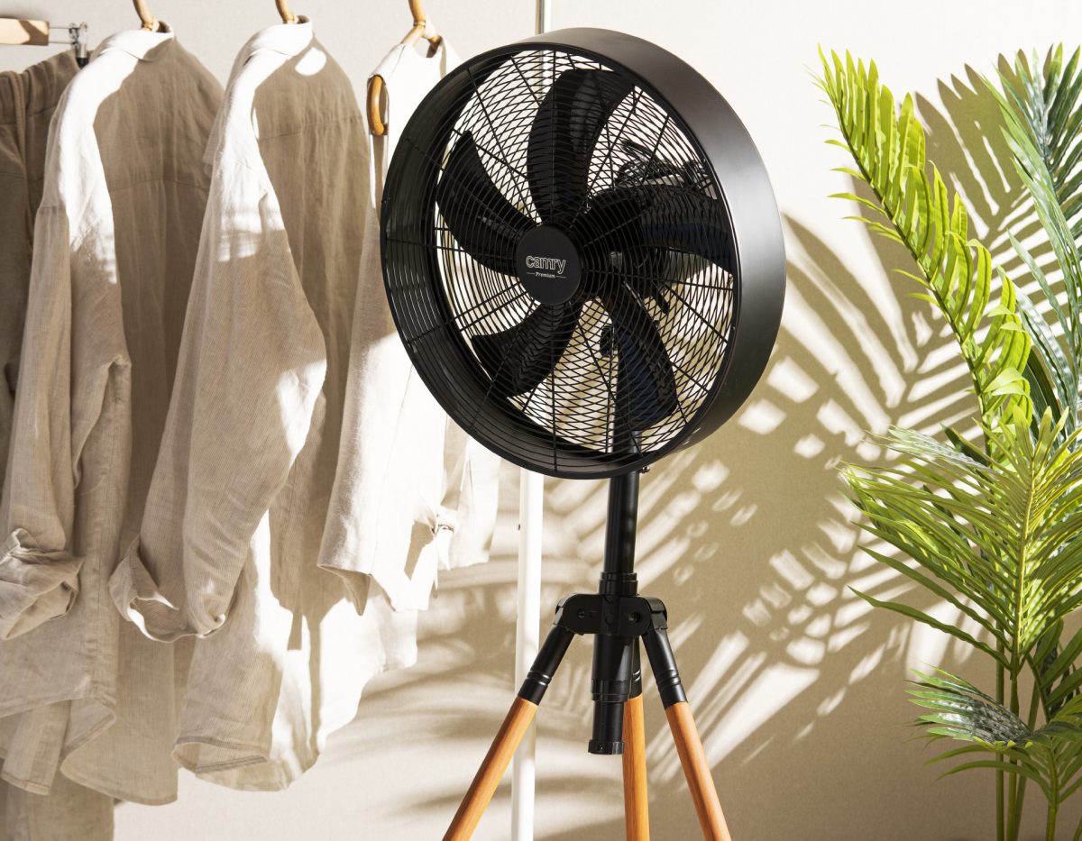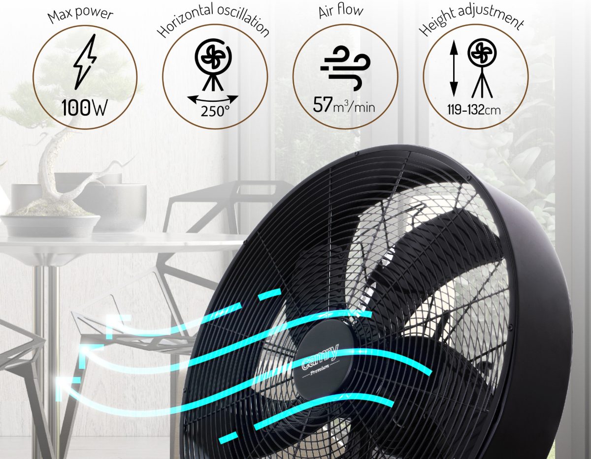 Este un model care functioneaza bine in spatii mari. Lofts si spatiile industriale necesita dispozitive cu mai multa putere si un aspect usor diferit pentru a se integra in designul si a completa stilul apartamentului. Diametrul de 40 de centimetri si fluxul de aer de 57 m3/minut garanteaza ca aerul va fi distribuit uniform chiar si intr-o camera mai mare. Trepiedul telescopic, la randul sau, este o optiune pentru a face ca rafalele de aer sa se ridice deasupra persoanelor care stau pe scaune, fotolii sau care se afla pe paturi, fara a sufla direct asupra acestora.